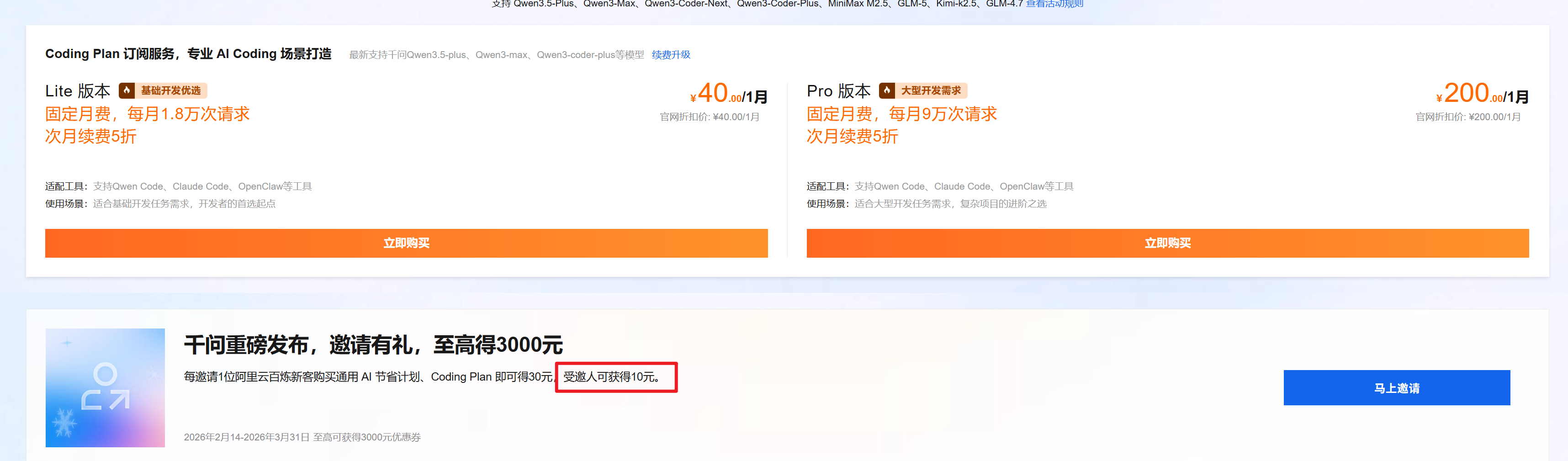 受邀注册可获得10元代金券,抵扣Coding Plan,我就忘记点别人的链接了!!